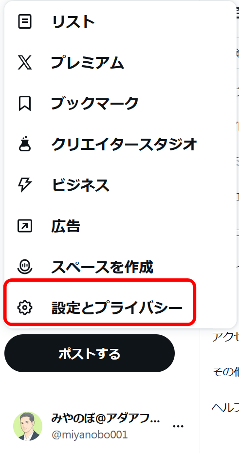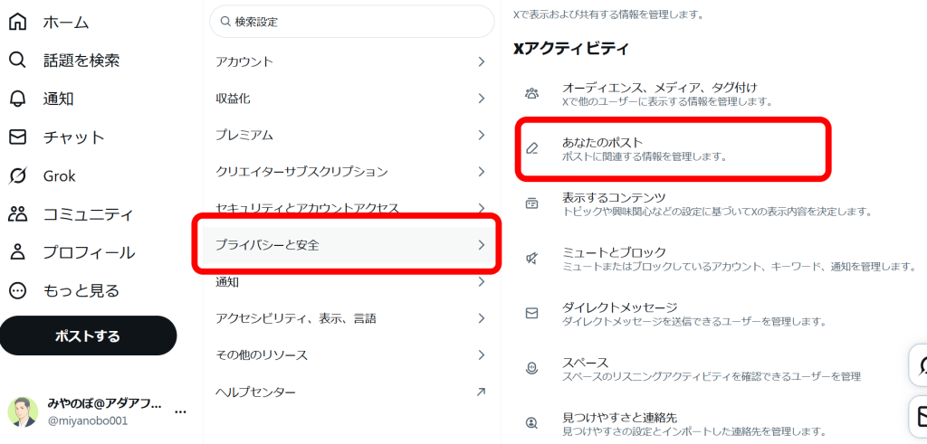 「プライバシーと安全」をクリックして「あなたのポスト」をクリック。