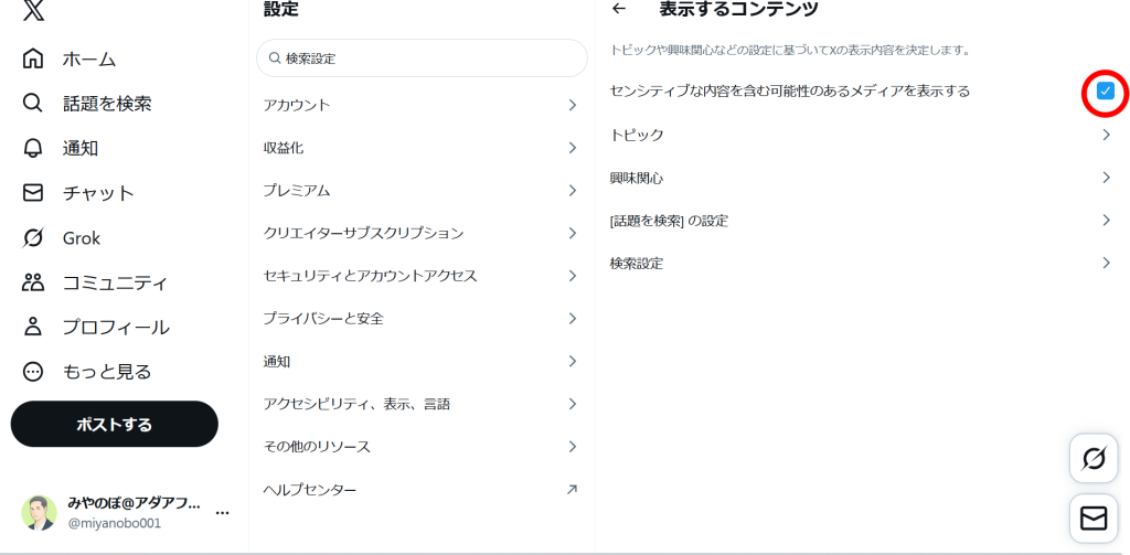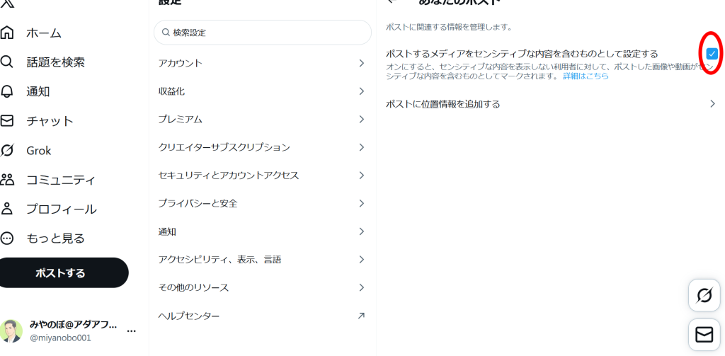 「安全とプライバシー」から「ポストするメディアをセンシティブな内容を含むものとして設定する」にもチェックを入れる。